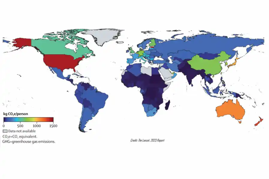 Global healthcare accounted for 4·6% of total GHG emissions, with healthcare-associated PM2·5 and Ozone responsible for millions of Disability-Adjusted Life Years (DALYs). Air pollution associated with healthcare delivery and supply chain led to ~4 million DALYs in 2020, >50% of these health harms were due to healthcare activities in China and 12% in the US.