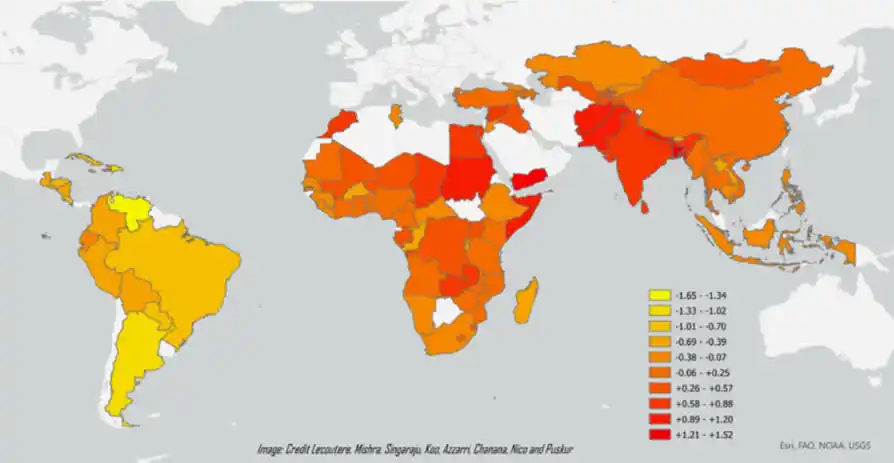 The climate-agriculture-gender inequality hotspot risk index captures the convergence of climate hazards, exposure, and vulnerability due to gender inequalities faced by women in agri-food systems. Each country’s risk is based on these indicators, with the resulting ‘hotness’ score showing LMIC climate risks on women in agriculture in the different regions.